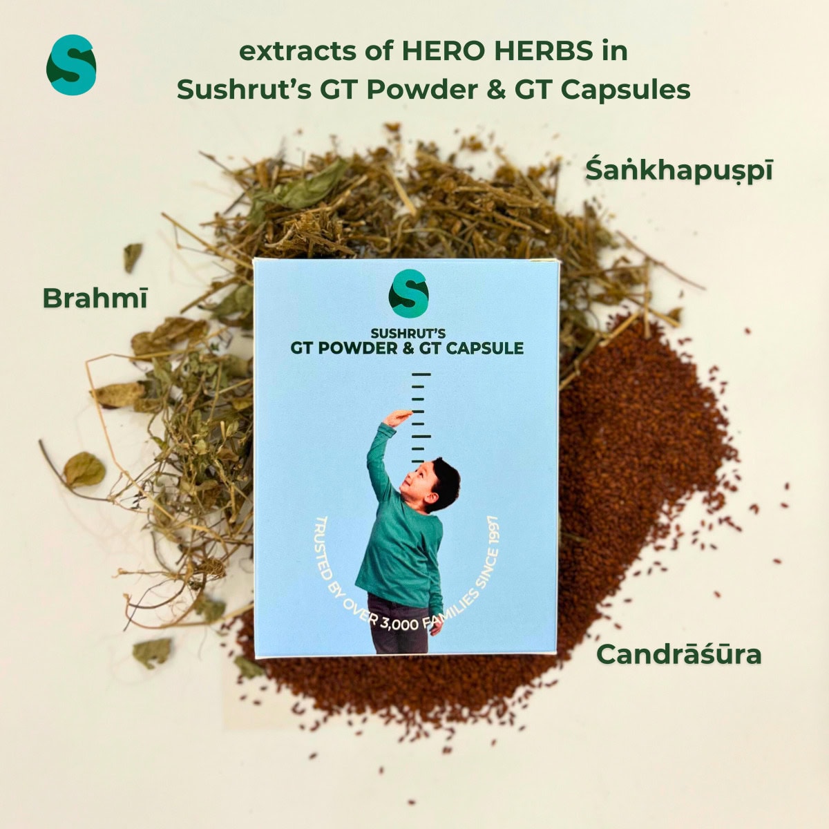 Sushrut’s GT Powder and GT Capsules contain a proprietary formulation of herbal extracts, featuring Brahmī (ब्राह्मी), Śaṅkhapuṣpī (शंखपुष्पी), and Candrāśūra (चंद्राशूर). Our formulation is registered with AYUSH, Chhattisgarh and is manufactured at a GMP-certified unit. Our proprietary formulation has been used by more than 3000 children without any side effect since 1997.